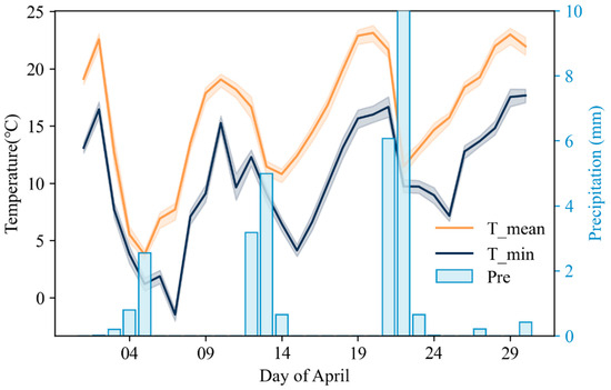 Changes in minimum temperature, daily mean temperature and daily precipitation in western Shandong Province in April 2018.