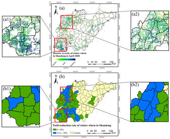 Comparison of winter wheat damage extent (a) and the yield reduction rate of winter wheat at the county level (b) in Shandong Province in 2018. The extent of damage (a1) and the yield reduction rate of winter wheat at the county level (b1) in the southwest Shandong, and the extent of damage (a2) and the yield reduction rate of winter wheat at the county level (b2) in the northwest Shandong are highlighted (range in red boxes).