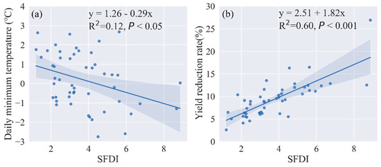 Scatterplot between the SFDI and the daily minimum temperature (a), the SFDI and the yield reduction rate (b).