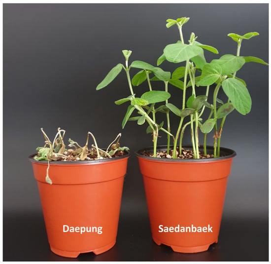 Daepung, Saedanbaek, and 72 RILs derived from crosses between Daepung and Saedanbaek were used in this study. Daepung is an elite Korean cultivar with lodging tolerance [61], and Saedanbaek is widely used in making tofu because of its high protein content and resistance to bacterial pustules [62]. Both parental lines exhibited white flowers, yellow seeds, and determinate growth habits. In our preliminary experiments, two soybean varieties, Daepung and Saedanbaek, were classified as susceptible or resistant to P. sojae isolate 2858 (Figure 1). In 2019, the RIL population was obtained from Dankook University in Cheonan, Republic of Korea. To propagate the seeds, the F6-derived RIL population was grown in a research field at the Chungnam National University, Daejeon, Republic of Korea. In this study, two parents and 72 RILs were used in subsequent experiments.