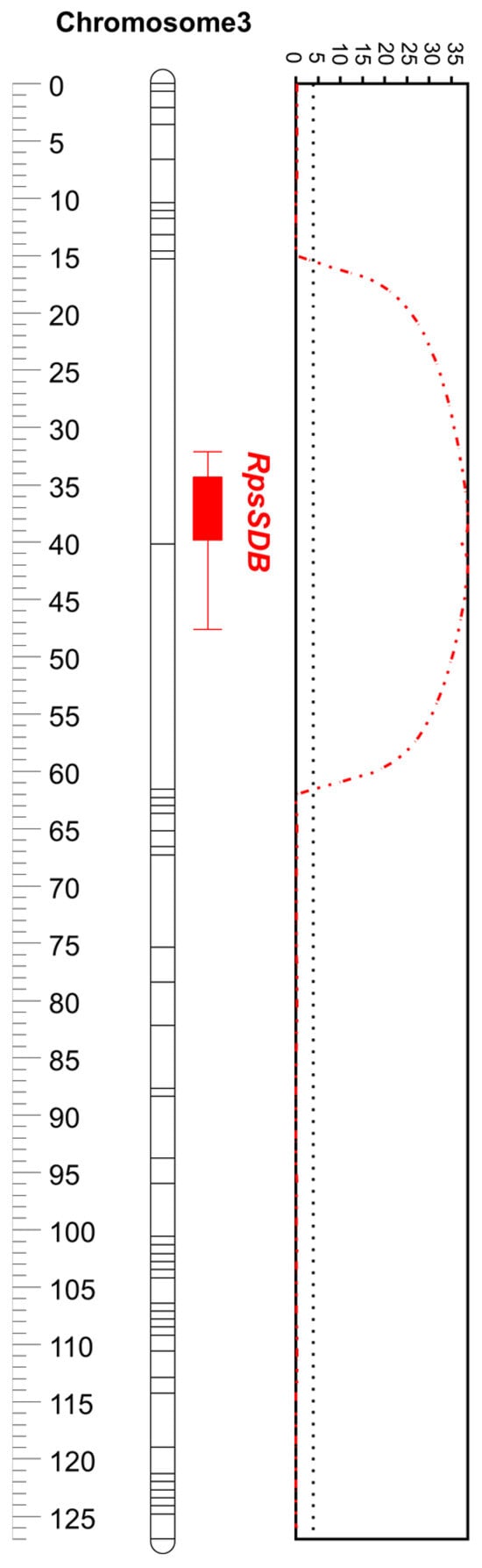The genomic region for resistance to Phytophthora sojae isolate 2858 identified on chromosome 3 in the Daepung × Saedanbaek population. The bands on the chromosome indicate that SNP marker loci integrated into the genetic map. The LOD graph to the right of the chromosome show the most likely position of the resistance gene locus. The hatched line on the LOD graph indicates the LOD threshold. The 1- and 2-LOD intervals are displayed as bar and loid lines, respectively.