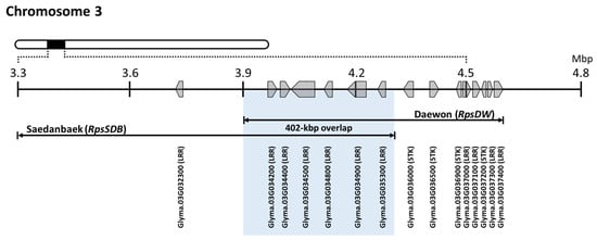 The resistant allele of Saedanbaek identified in the present study was named RpsSDB to distinguish it from other colocalized Rps alleles (Figure 3). RpsSDB partially overlapped with RpsDW detected in ‘Daewon’, which was previously mapped on chromosome 3 [24]. To distinguish between the two Rps loci, recombinants within the target interval were screened using RIL populations. As RILs with recombination breaks within the RpsSDB were not detected in the Saedanbaek population, RpsSDB and RpsDW overlapped in an approximately 402 kbp interval (3,893,390–4,295,128 bp) (Figure 3). According to the soybean reference genome (Glyma.Wm82.a2.v1), 53 and 31 genes, in total, were annotated in the interval of RpsSDB and RpsDW intervals, including seven and eight copies of NBS-LRR- or STK-coding genes, the two main categories of disease resistance genes, respectively (Table S1). The overlapped interval included six LRR-coding genes, i.e., Glyma.03G034200, Glyma.03G034400, Glyma.03G034500, Glyma.03G034800, Glyma.03G034900, and Glyma.03G035300 (Figure 3, Table S1).