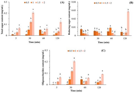 The highest level of reducing sugars (0.029 mg/mL) was obtained via incubation of 2 mg/mL APSs with β-agarase for 120 min (Figure 1B). Moreover, the highest oligosaccharide content of 0.203 mg/mL was obtained through incubating 2 mg/mL APSs with β-agarase for 30 min, with a statistical difference compared to the oligosaccharide content at other APS concentrations observed (Figure 1C).