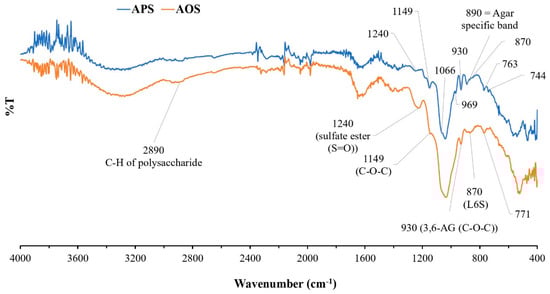 The chemical structure and functional groups of APSs and AOSs were analyzed via FT-IR spectroscopy. The FT-IR spectra of APSs and AOSs exhibited the same characteristics. The strong signals at 1240 cm−1, 1066 cm−1, 930 cm−1, and 890 cm−1 corresponded to typical features of agar (Figure 2). Signals in the range of 800–900 cm−1 corresponded to the sulfated group substitution in the structure. The signal at 930 cm−1 represented the C-O-C bridge of the 3,6-anhydro-α-L-galactose group. The signal at 1240 cm−1 contributed to the sulfate group (S=O) in a molecule. The signals at 763 cm−1, 771 cm−1, 890 cm−1, and 1066 cm−1 were assigned to agar-specific polysaccharide signals. The signal at 870 cm−1 represented a sulfate substitution in the C-6 position of L-galactose (L-galactose-6-sulfate (L6S)) in the agar structure. The signal at 2890 cm−1 contributed to the C-H stretching vibration of polysaccharides in general [26,27,28,29,30].