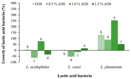 Effect of AOSs (0.5, 1.0 and 1.5%) and GOSs on the growth of L. acidophilus, L. casei, and L. plantarum. Data are presented as the mean of triplicate determination ± standard deviation. Different letters above the bars indicate a significant difference (p ≤ 0.05).