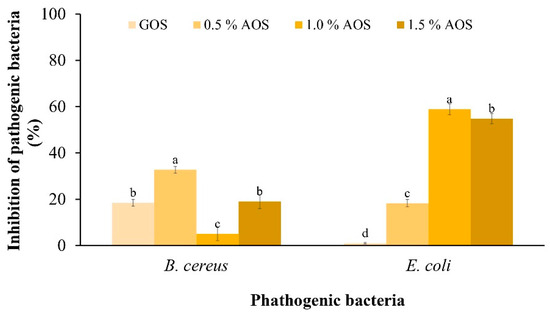 Inhibitory effect of AOSs (0.5, 1.0 and 1.5%) and GOSs on B. cereus and E. coli. Data are presented as the mean of triplicate determination ± standard deviation. Different letters above the bars indicate a significant difference (p ≤ 0.05).
