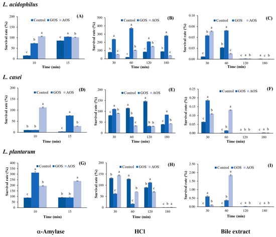 The percentage of survival of L. acidophilus, L. casei, and L. plantarum under the different simulated gastrointestinal conditions. Under α-Amylase conditions (A,D,G); HCl conditions (B,E,H), and bile extract conditions (C,F,I). Data are presented as the mean of triplicate determination ± standard deviation. Different letters above the bars indicate a significant difference (p ≤ 0.05). GOS: galacto-oligosaccharides; and AOS; agar oligosaccharide.