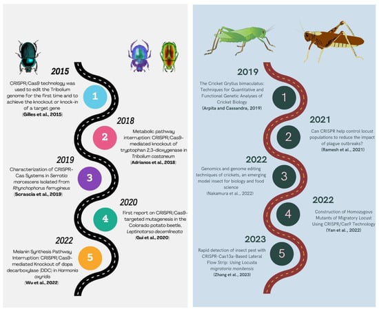 Summarizing the history of CRISPR/Cas9 technology in Coleopteran and Orthopteran insects [157,159,160,161,162,163,164,165,166,167].
