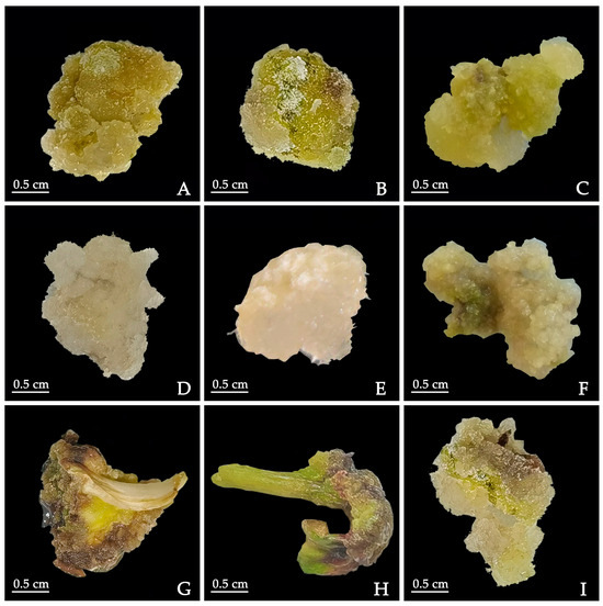 Three kinds of explants, including cotyledon, hypocotyl, and embryo, were used, and all formed regular and healthy callus in MS medium supplemented with 1.0 mg·L−1 6-BA and either 1.0 mg·L−1 NAA or 2.0 mg·L−1 2,4-Dichlorophenoxyacetic acid (2,4-D). The callus induction rate ranged between 83.89% and 98.89% (Table 1). However, the callus induction rate from cotyledon explants in the three auxins, which can be as high as 98.89%, was better than that observed in hypocotyl and embryo explants (Table 1). Morphologically, the callus induced from cotyledon and hypocotyl explants in 1.0 mg·L−1 NAA was compact and light yellow, and the growth was strong (Figure 1A,B). The callus of the embryo in the medium supplemented with 1.0 mg·L−1 NAA expanded at the base of the embryo, and it contained a compact callus with a light yellow, transparent and watery appearance (Figure 1C). Furthermore, the surface of the cotyledon-derived callus and the hypocotyl-derived callus in 2.0 mg·L−1 2,4-D was white-flocculent, soft, and fragile (Figure 1D,E). The callus of embryo in the medium supplemented with 2.0 mg·L−1 2,4-D was compact, light yellow and transparent (Figure 1F). At 2.0 mg·L−1 PIC, the callus formed by cotyledon and hypocotyl was poorly dedifferentiated with a hard texture and obvious brown surface (Figure 1G,H). The callus induction rate from embryo explants was low in the medium supplemented with 2.0 mg·L−1 PIC, and the site of occurrence was not fixed (Figure 1I). Overall, the appearances of the callus from the three explants were quite different.