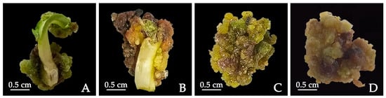 - Kulus, D.; Tymoszuk, A. Induction of callogenesis, organogenesis, and embryogenesis in Non-meristematic explants of bleeding heart and evaluation of chemical diversity of key metabolites from callus. Int. J. Mol. Sci. 2020, 21, 5826. [Google Scholar] [CrossRef]