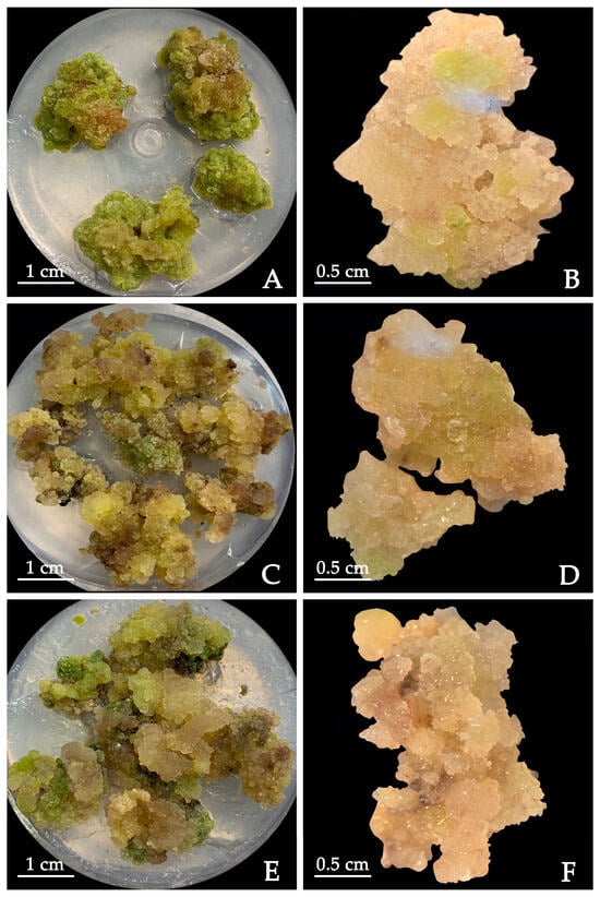 Induction of calluses from cotyledon of P. lactiflora with different PIC concentrations: (A) 0 mg·L−1 PIC, (B) 0 mg·L−1 PIC under stereomicroscope, (C) 2.0 mg·L−1 PIC, (D) 2.0 mg·L−1 PIC under stereomicroscope, (E) 4.0 mg·L−1 PIC, (F) 4.0 mg·L−1 PIC under stereomicroscope. PIC: picloram.