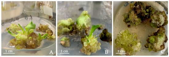 The zygotic embryos, cotyledons, and hypocotyls were cultured in MS medium supplemented with 1.0 mg·L−1 BA combined with 2.0 mg·L−1 PIC, 1.0 mg·L−1 BA combined with 2.0 mg·L−1 2,4-D or 1.0 mg·L−1 BA combined with 1.0 mg·L−1 NAA, respectively, to induce calluses under dark conditions. After 45 days, the callus induction rates of the three explants on different media were observed.