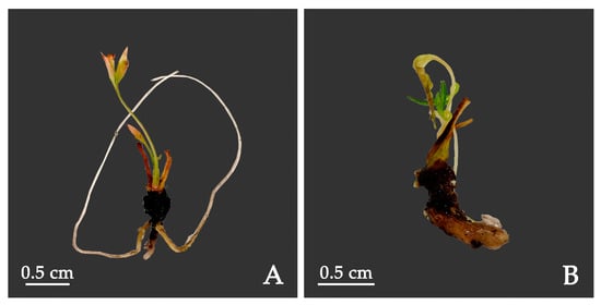 P. lactiflora shoots rooted in ½ MS + 3 g/L AC medium with different auxins: (A) 1.0 mg·L−1 IBA, (B) 0.5 mg·L−1 IAA+ 0.5 mg·L−1 IBA. The images shown are of plantlets after 45 days in rooting medium. IAA: indole-3-acetic acid; IBA: indole-3-butyric acid.