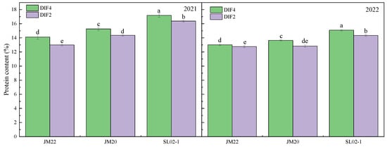 Effect of nitrogen application by high-frequency versus low-frequency drip irrigation on protein content of medium-gluten and strong-gluten wheat. JM22, JM20, and SL02-1 refer to the medium-gluten wheat variety Jimai22, and the strong-gluten wheats Jimai20 and shiluan02-1, respectively. Different lower-case letters indicate significant differences at p < 0.05.