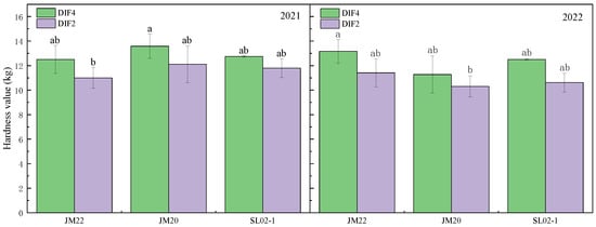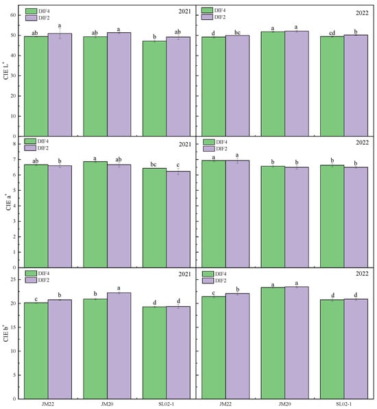 The protein content of the three varieties with high frequency of nitrogen application was significantly higher than that with low frequency by 2–8.6% (Figure 1), and applying nitrogen fertilizer at all critical periods instead of separately at the nodulation and flowering stages resulted in higher protein content. Shiluan02-1 had the highest protein content (14.3–17.2%), followed by Jimai20 (12.8–15.3%) and Jimai22 (12.8–14.1%). The protein content of the second year was lower than the first year, which might have been antagonized by the yield [,], which was 43% higher than the first year as shown in our previous study []. High frequency of nitrogen application increased the hardness of the grains, but it was possible that the large differences between the grains resulted in no significant differences between treatments (Figure 2). High frequency of nitrogen application reduced the brightness of wheat kernels, increased redness, and reduced yellowness; CIE L* was lower in DIF4 than in DIF2; CIE a* was higher than in DIF2; and CIE b* was lower than in DIF2 (Figure 3).
