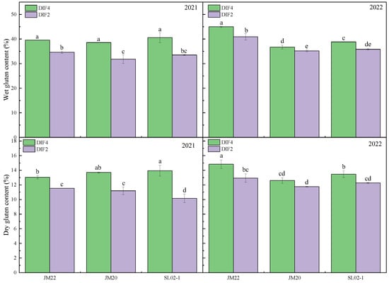 Effect of different frequencies of nitrogen application by drip irrigation on wet/dry gluten content of medium-gluten and strong-gluten wheat. JM22, JM20, and SL02-1 refer to the medium-gluten wheat variety Jimai22, and the strong-gluten wheats Jimai20 and shiluan02-1, respectively. Different lower-case letters indicate significant differences at p < 0.05.