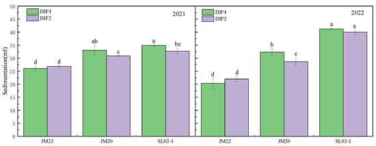 Effect of different frequencies of nitrogen application by drip irrigation on sedimentation of medium-gluten and strong-gluten wheat. JM22, JM20, and SL02-1 refer to the medium-gluten wheat variety Jimai22, and the strong-gluten wheats Jimai20 and shiluan02-1, respectively. Different lower-case letters indicate significant differences at p < 0.05.