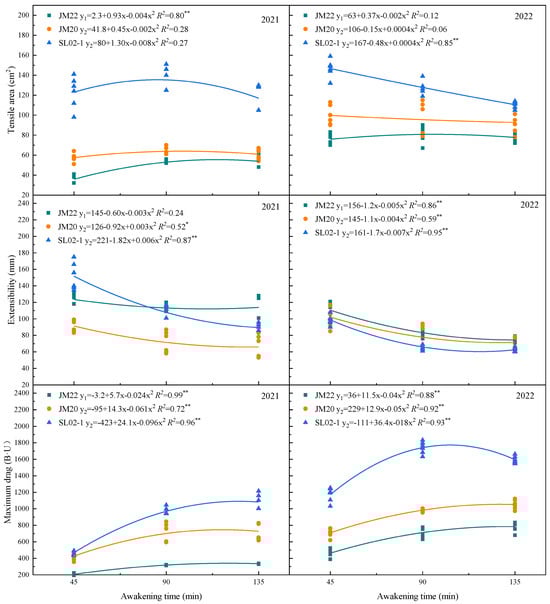 Trend of key tensile parameters over time. JM22, JM20, and SL02-1 refer to the medium-gluten wheat variety Jimai22, and the strong-gluten wheats Jimai20 and shiluan02-1, respectively. * indicates a significant difference at p < 0.05 and ** indicates a significant difference at p < 0.01.