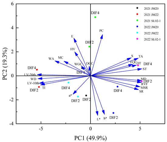Principal component analysis of quality traits of wheat grain and its flour. HV stands for hardness value; PC stands for protein content; WGC means wet gluten content; DGC means dry gluten content; S means sedimentation; L*, a*, and b* represent CIE L*, CIE a*, and CIE b*, respectively; WA stands for water absorption; MC stands for moisture content; DT stands for development time; ST stands for stability time; TI stands for tolerance index; LV-10th stands for lowering value in the 10th minute; WD stands for weakening degree; LV-20th stands for lowering value in the 20th minute; FQC stands for flour quality index; TA stands for tensile area; RVF stands for resistance value at 5 cm; E stands for extensibility; MD stands for maximum drag; SR stands for stretch ratio; MSR stands for maximum stretch ratio.