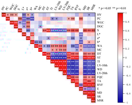 Correlation analysis of quality traits of wheat grain and its flour. HV stands for hardness value; PC stands for protein content; WGC means wet gluten content; DGC means dry gluten content; S means sedimentation; L*, a*, and b* represent CIE L*, CIE a*, and CIE b*, respectively; WA stands for water absorption; MC stands for moisture content; DT stands for development time; ST stands for stability time; TI stands for tolerance index; LV-10th stands for lowering value in the 10th minute; WD stands for weakening degree; LV-20th stands for lowering value in the 20th minute; FQC stands for flour quality index; TA stands for tensile area; RVF stands for resistance value at 5 cm; E stands for extensibility; MD stands for maximum drag; SR stands for stretch ratio; MSR stands for maximum stretch ratio. * denotes significant differences at p ≤ 0.05, ** denotes significant differences at p ≤ 0.01.