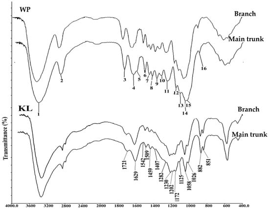 Wood powder (WP) and Klason lignin (KL) were used for FTIR analysis. KBr pellets for IR spectroscopy were prepared using macrotechnique (13 mm ø pellet; Ca. 1.5 mg sample with 350 mg KBr). The spectra were recorded with the FTIR spectrometer with a TGS detector (Perkin Elmer, Spectrum GX, Shelton, USA) at a resolution of 4 cm−1 for 32 scans in the range from 600 to 4000 cm−1; background spectra of a clear window were recorded prior to the acquisition of sample spectra. The spectrum of the background was subtracted from spectra of the sample before conversion into absorbance units. For each sample, three different sub-samples were analyzed and averaged to give a mean spectrum per individual sample.