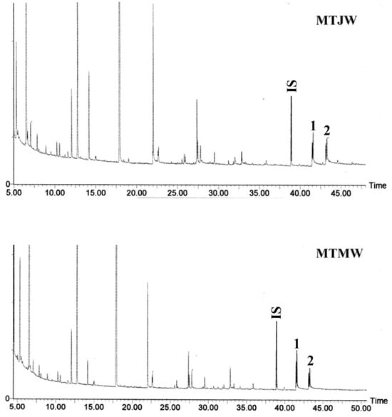 Gas chromatographs of TMS thioacidolysis products recovered from juvenile (MTJW) and mature wood (MTMW) from the main trunk of Leucaena leucocephala. Numbered peaks correspond to TMS thioacidolysis products (C6C3 arylglycerol-β-aryl ether) 1. G-CHSEt-CHSEt-CH2SEt erythro/threo, 2. S-CHSEt-CHSEt-CH2SEt erythro/threo. G: Guaiacyl, S: Syringyl, IS: Internal standard (Tetracosane).