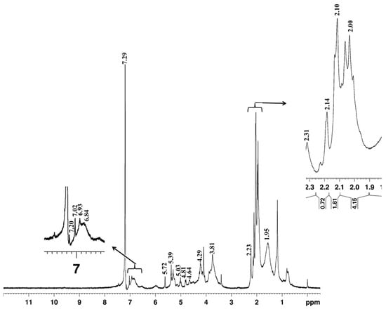 Acetylated Bjorkman lignin (10 mg) was dissolved in 0.5 mL of CDCl3. The 1H NMR spectra were recorded with an Avance III 400 MHz FT-NMR spectrometer (Brukar BioSpin GmbH, Rheinstetten, Germany). Proton signals were integrated from base line and referred to the integral signal of the methoxyl proton for the quantification of aliphatic and phenolic protons. The ratio of aromatic to methoxyl protons was determined by integrating signals at 6.8 to 7.2 and 3.4 to 4.3, respectively [19].