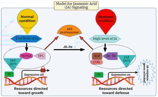 The JA signaling pathway comprises two distinct phases: repression, which occurs under normal physiological conditions, and activation, which is triggered in response to stress conditions. During normal conditions, the cytoplasm typically maintains a low concentration of JA-Ile, thereby causing the genes associated with JA to remain in an inactive state [78]. Gene promoters exhibit an affinity for various transcription factors (TFs), which are subjected to repression by various transcriptional repressors known as JAZ proteins, a group characterized by the presence of the jasmonate ZIM domain [79]. JAZ proteins initiate the formation of an active, closed complex referred to as the JAZ–NINJA–TPL complex by recruiting the protein known as topless (TPL) and the adaptor protein specific to JAZ (NINJA). This complex avoids the start of jasmonate-responsive genes [80]. During stress, the phytohormone jasmonic Acid-Isoleucine (JA-Ile) exhibits an increased accumulation within the cellular cytosol. Subsequently, these JA-Ile molecules are transported across cellular membranes to access the nucleus, facilitated by the catalytic activity of jasmonic Acid Transfer Proteins, specifically AtJAT1/AtABCG16. This process marks the initiation of the JA signaling pathway [78]. Within the cellular nucleus, the SCF complex, composed of kinetochore protein 1 (SKP1), cullin 1 (CUL1), and an F-box protein, serves as an E3 ubiquitin ligase that plays a pivotal role in facilitating JA responses. The initial step involves the translocation of JA-Isoleucine (JA-Ile) into the nucleus, where it is recognized by the F-box protein COI1, an integral component of the SCF complex. Subsequently, the COI1-JAZ co-receptor complex is activated upon detection of JA-Ile, thereby facilitating the interaction between JAZ (jasmonate ZIM-domain) proteins and COI1. This interaction triggers the degradation of JAZ proteins within the 26S proteasome (Figure 3). Consequently, the depletion of JAZ proteins results in the transcriptional activation of transcription factors (TFs) and the subsequent expression of genes responsive to JA signaling pathways [81]. Amongst plant natural products, JAs play a key role in plant defense. JA biosynthesis depends on the circumstances in which the plant is grown. Genetic engineering can be used to change the genetics of JA synthesis to form more stress-resistant cultivars. Moreover, exogenous JAs are mostly used as anti-stress protective mediators by improving plant resistance. Further development of nano-biotechnology will ease the improvement of Nano carriers for efficient transfer of exogenous JAs to directed plant cells [82].