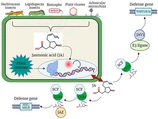 In the dynamic and constantly changing natural environment, plants may experience a multitude of biotic factors, including a wide array of pathogens, encompassing biotrophic, hemi-biotrophic, and necrotrophic pathogenic organisms, which are detrimental to the optimal development of plants [74]. Plant resistance responses to these stresses, especially to insects, are controlled by molecular signals, among which the most significant signaling molecule is JA. Certainly, lipid-derived jasmonates (JAs) play a pivotal role in various aspects of plant development and serve as integral components in the plant’s defense mechanisms against diverse pathogens, specifically necrotrophic fungal pathogens such as Alternaria brassicicola, Botrytis cinerea, Plectosphaerella cucumerina, and Pythium spp. These pathogens pose substantial threats to plant viability and growth [75,76]. Pathogen attack stimulates the biosynthesis of jasmonoyl-L-isoleucine (JA-Ile), which subsequently engages with the COI1-JAZ receptor, instigating the degradation of JAZ repressor proteins and the commencement of transcriptional processes associated with the activation of plant defense mechanisms (Figure 3). Interestingly, certain highly virulent pathogens have evolved distinct strategies to inhibit the JA signaling pathway and facilitate their utilization of plants as host organisms [75,77].