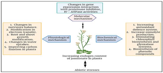 Summary of jasmonates mechanisms in enhancing abiotic stress tolerance in plants.