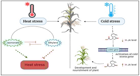 High temperature (HT) is the eminent dilemma of the modern era because of the intense climatic variations that cause massive losses in the production of crop yield and ultimately endanger food security. The yield loss due to heat stress may thrust living beings to nutritional deficiencies [8,95]. Recently, a research study conducted in African tropical and subtropical zones on maize crops revealed a yield loss of approximately 1–2%, respectively, when a single-degree elevation in temperature occurred beyond 30 °C [99,110]. Under heat stress, many pathways are activated by plant metabolism to mitigate the effect of heat stress. These all are interlinked with gene expression by which heat shock proteins are produced as special proteins of low molecular weight. The principal mechanism employed by plants to mitigate the effects of heat stress involves the synthesis of heat shock proteins. This mechanism constitutes a conserved molecular system in many plants to produce heat shock proteins to mitigate the effects of high temperatures. JA is recognized as a prominent phytohormone with a pivotal role in the biosynthesis of numerous secondary metabolites, as well as the induction of heat shock proteins and other phytohormones. Consequently, JA assumes a significant regulatory role in the modulation of heat shock protein production within plants [95,111].