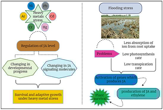 JA signaling plays a pivotal role in plant survival under heavy metals and flooding stress conditions.