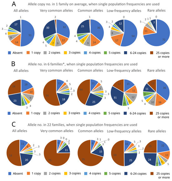 The proportion of alleles found in the A. glutinosa Vytėnai progeny plantation per different allele frequency categories represented for different sample groups ((A): allele copy number in one open pollinated (OP) family on average, when single population frequencies are used; (B): allele copy number in 6 OP families, when single population frequencies are used; (C): allele copy number in 22 OP families, when single population frequencies are used; (D): allele copy number in 6 OP families, when 5-population average frequencies are used; (E): allele copy number in 22 OP families, when 5-population average frequencies are used; (F): allele copy number in 22 OP families, when 10-population average frequencies are used). The graphs representing the actual allele numbers are given in Supplementary Figure S1. * OP families no 89, 97,103, 121, 135, and 139.