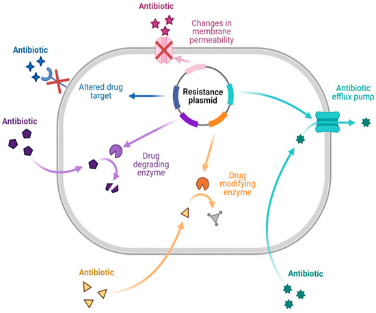 Antibiotic resistance mechanisms [7,12,13,14]. Created with BioRender.com.
