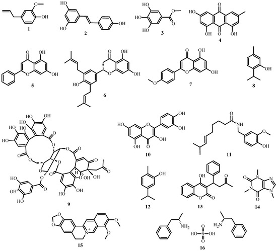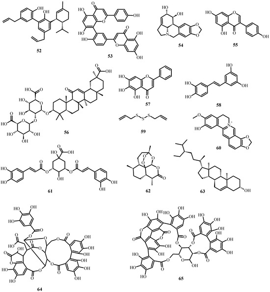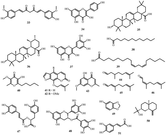 Plant biocompounds may function similarly to conventional antiviral medications by inhibiting viral replication polymerase, protease, integrase, fusion molecules, and cell membrane binding. For example, the exposure of non-enveloped norovirus to 0.5% of carvacrol (12) results in the degradation of its capsid [113]. Some polysaccharides may also deter viruses from attaching to cells, while thiophenes, terpenoids, and polyacetylenes can interact with the membrane of infected cells [114]. Lignans, phenolic compounds, terpenoids, flavonoids, alkaloids, and furocoumarins can all inhibit viral replication. Biocompounds of Allium sativum are among the most studied; they have antiviral activity against human, animal, and plant infections. Multiple of these metabolites can strengthen the immune system’s response to infections. This biocompound interacts in vivo with thiols such as glutathione and L-cysteine to produce S-allyl-mercapto-glutathione (SAMG) and S-allyl-mercapto-cysteine (SAMC), which can degrade viral protein. In addition, it contains lectins, flavonoids (kaempferol (34), quercetin (10), and myricetin (37)), polysaccharides (fructan), steroids, saponins, fatty acids (lauric (38) and linoleic acid (39)), diverse enzymes, vitamins (A, B1, and C), allixin (40), minerals (Ca, Cu, Fe, K, Mg, Zn, and Se), and amino acids [115].