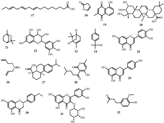 | Allicin (26) | Allium sativum | Interferes with the metabolic systems of H. pylori, S. epidermidis, B. cepacia, P. aeruginosa, and S. aureus. | [46] |