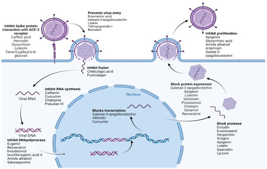 Various biocompounds’ potential antiviral mechanisms of action. Created with BioRender.com.