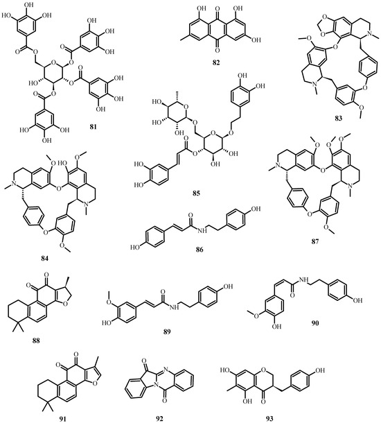 Structures of promising plant-derived compounds merit combating drug-resistant pathogenic microbes, from Table 2.