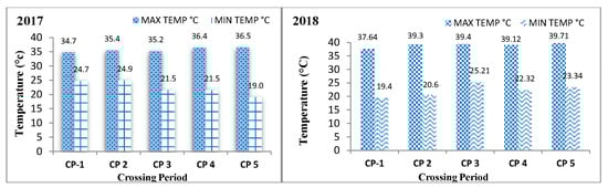 Average maximum and minimum temperature during different crossing periods in bottle gourd during Kharif 2017 and summer 2018.