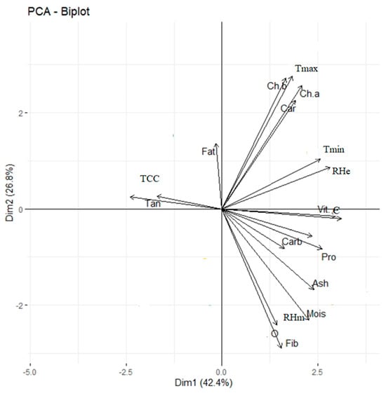 The correlation analysis of biochemical constituents with weather variables showed a significant variation among the five different crossing periods (Table 11). The protein content correlated significantly with minimum temperature and morning and evening relative humidity. Crude fiber (r = 0.956 **), TSS (r = 0.990 **), and total carbohydrate content (r = 0.813 *) had a highly positive correlation with minimum temperature. Vitamin C accumulation (r = 0.967 **) positively and significantly correlated with minimum temperature. With the temperature rise, the moisture content also increased, as shown by a positive correlation (r = 0.827 *) with maximum temperature, thus justifying the present study results. A graphical representation illustrating the relationship between the traits analyzed in the present study was obtained through a multivariate analysis showing PCA based on the Cos2 value. The Cos2 of the variables indicated that the moisture, CP, CF, lipids, vitamin C, and others traits in the positive direction and the fats and TCC in the negative direction were the major contributing traits (Figure 3).
