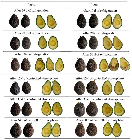 At the end of storage, it was observed that only the avocados that were refrigerated for 30 d (R30d) developed physiological disorders evidenced by the appearance of dark areas at the exocarp level. This incidence was lower in early harvest (1 of 20 fruits) compared to late harvest (4 of 20 fruits). Disorders were categorized according to the Agroforum scale (Supplementary Figure S1), as type 3 and 3–4 defects, respectively (Figure 1). Lenticel damage and dark spots of varying extents were evidenced. No defects were observed at the mesocarp level for all treatments evaluated, including R30d. Figure 2 shows the photographic records associated with the presence of physiological disorders in the exocarp and mesocarp of avocados after reaching consumption maturity or the ready-to-eat stage. The characteristic dark color developed in the exocarp in all treatments, even in those where surface damage was found (R30d). Instead, in the mesocarp of some fruits (R30d), pulp and vascular browning damages were observed, more evident and extensive in the late harvest (5 out of 10 fruits with defects type 4) compared to the early harvest (3 out of 10 fruits with defects type 3) fruit. Avocados under a controlled atmosphere did not present any damage.