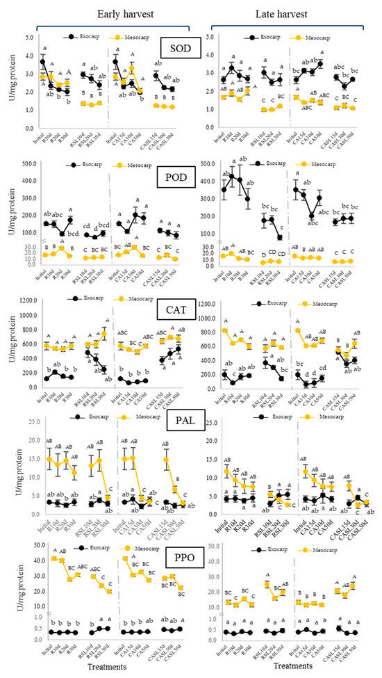 Changes in the enzymatic activities of superoxide dismutase (SOD), peroxidase (POD), catalase (CAT), phenylalanine ammoniolyase (PAL) and polyphenoloxidase (PPO) in the exocarp (black line) and mesocarp (yellow line) of Hass avocados stored under refrigeration for 10, 20 and 30 d (R10d, R20d and R30d) and controlled atmosphere for 15, 30 and 50 d (CA15 d, 30 d and 50 d) and at their respective consumption maturities (SL). Results are expressed as the mean (n = 10) ± standard error. Different capital letters and lowercase letters represent significant differences (p < 0.05) between mesocarp and exocarp samples, respectively, evaluated by storage type.