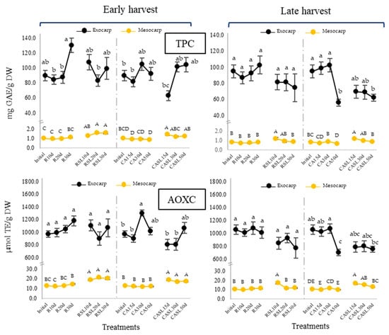 The non-enzymatic antioxidant system represented by total phenolic compounds (TPC) and AOXC displayed notably higher values in the exocarp compared to the mesocarp (Figure 4). A significant increase in TPC (p < 0.05) was observed for exocarp samples corresponding to R30d of early harvest but a significant decrease for CA50d of late harvest. Non-notorious changes were observed at the mesocarp level except for CASL15-50d of late harvest, with most of the results related to the AOXC trends. Moreover, TPC and AOXC showed a tendency to increase at consumption maturity in the mesocarp, except for RSL20d-30d of late harvest.