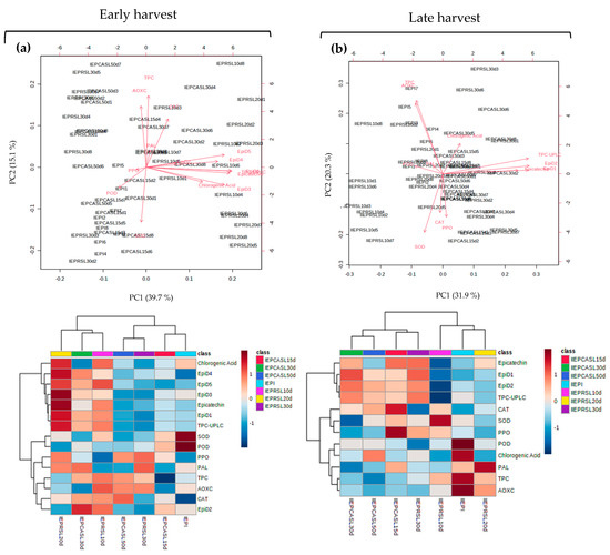Biplot and heat maps for exocarp (EP) displaying the samples and variables overlaid for the early (a) and late-harvest (b) datasets. IEPI and IIEPI = initial samples at early (I) and late (II) harvests. R10d, R20d and R30d = avocados cold stored for 10, 20 and 30 d. RSL10d, RSL20d and RSL30d = at consumption maturity from refrigerated samples for 10, 20 and 30 d. CA15d, CA30d and CA50d = avocados stored for 15, 30 and 50 d under controlled atmosphere. CASL15d, CASL30d and CASL30d = at consumption maturity from controlled atmosphere for 10, 20 and 30 d. SOD = superoxide dismutase, POD = peroxidase, CAT = catalase, PAL = phenylalanine ammoniolyase, PPO = polyphenoloxidase, TPC = total phenolic compounds, AOXC = antioxidant capacity, TPC-UPLC = total phenolic compounds quantified by UPLC, EpiD1-D5 = epicatechin-derived phenolic compounds 1 to 5.