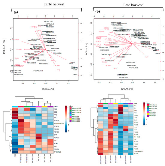 Biplot and heat maps for mesocarp (ME) displaying the samples and variables overlaid for the early (a) and late harvest (b) datasets. IMEI and IIMEI = initial samples at early (I) and late (II) harvests. R10d, R20d and R30d = avocados cold stored for 10, 20 and 30 d. RSL10d, RSL20d and RSL30d = at consumption maturity from refrigeration for 10, 20 and 30 d. CA15d, CA30d and CA50d = stored for 15, 30 and 50 d under controlled atmosphere. CASL15d, CASL30d and CASL30d = at consumption maturity from controlled atmosphere for 10, 20 and 30 d. SOD = superoxide dismutase, POD = peroxidase, CAT = catalase, PAL = phenylalanine ammoniolyase, PPO = polyphenoloxidase, TPC = total phenolic compounds, AOXC = antioxidant capacity, TPC-UPLC = total phenolic compounds quantified by UPLC, PCAD1-D8 = p coumaric acid-derived phenolic compounds 1 to 8, CAD1-2 = caffeic acid-derived phenolic compounds 1 and 2, SAD = syringic acid-derived phenolic compound.