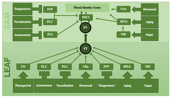 A simplified schematic representation of the physiological pathways involved in flowering, including photoperiod, autonomous, vernalization, hormonal, temperature, aging, and sugar. Each pathway has one major player which in turn regulates FT. These pathways, except for photoperiod, play a role not only in leaves, but also in shoot meristems. Flowering Locus T (FT), known as florigen, plays a central role as it travels long distances from leaf to the shoot apical meristem (SAM). Arrows indicate positive regulation, while blunt-ended arrows indicate negative regulation. Abbreviations: SVP = SHORT VEGETATIVE PHASE, FLC = FLOWERING LOCUS C, SOC1 = SUPPRESSOR OF OVEREXPRESION OF CO1, FT = FLOWERING LOCUS T, GA = GIBBERELLIC ACID, SPL = SQUAMOSA PROMOTER BINDING PROTEIN-LIKE, T6P = TREHALOSE-6-PHOSPHATE, CO = CONSTANS, CK = CYTOKININ.