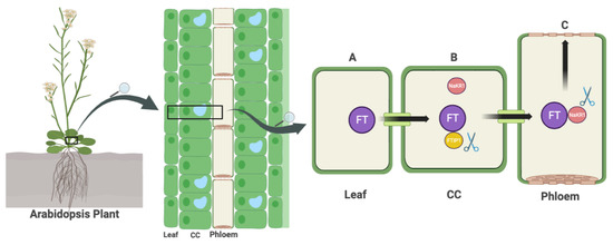 The involvement of the transmembrane region proteins FT-INTERACTING PROTEIN1 (FTIP1) and QUIRKY (QKY) in the initial export step has been identified. To reach the SAM, another protein called SODIUM POTASSIUM ROOTDEFECTIVE 1 (NaKR1) with a heavy-metal-associated (HMA) domain plays a crucial role. The activity of NaKR1 is positively regulated by the product of the photoperiodic pathway, CO, in the model plant Arabidopsis [30,87,88,89].