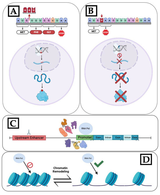 Various CRISPR-Cas approaches to modulate flowering time: (A) Cas cleavage-induced amino acid changes resulting in non-functional protein. (B) Cas cleavage resulting in stop codon insertion, terminating transcription, and preventing mRNA and, therefore, protein production. (C) Disruption of gene transcription by targeting elements involved in transcription, such as transcription factors, promoters, and upstream enhancer regions. The scissor symbols in the diagram indicate potential CRISPR knockout targets (D) Genes that regulate chromatin remodeling act as activators or inhibitors, affecting transcription by controlling chromatin structure (Created with BioRender.com).