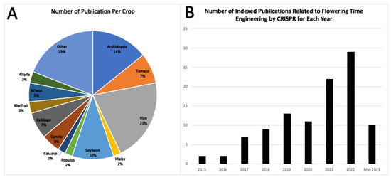 Since 2015, there has been a striking trend in the scientific literature regarding the manipulation of the flowering time using CRISPR technology. From then until now (mid-2023), there have been numerous publications investigating different gene families. These studies cover a wide range of plant species, with a particular focus on altering the flowering time. A thorough review was conducted of 103 peer-reviewed research publications, which are listed in Table 1. Table 1 provides a comprehensive overview of genes with diverse functionalities that contribute to successful flowering time engineering. These genes include transcriptional regulators, non-coding RNAs, enzymes, signaling molecules, chromatin modifiers, epigenetic modifiers, and many more (Figure 4).