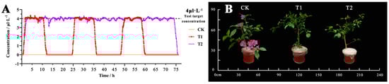 Gas concentration and plant changes under different concentration treatments. Note: CK, clean air; T1, 4 μL·L−1 (8 h/d); T2, 4 μL·L−1 (24 h/d). (A) Changes in NO2 concentration within 72 h of the fumigation box during the experimental period (data source: cloud platform monitoring data). (B) Changes in overall morphology of B. glabra ‘Elizabeth Angus’.